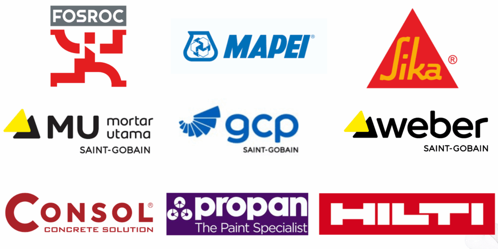 * Waterproofing *PU Waterproofing *Epoxy flooring *PU Flooring *Floor Hardener *Concrete Repair *Epoxy Injection *Grouting Injection *Bonding Agent